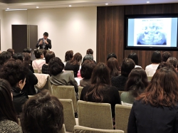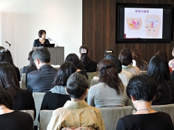 胎児が安定した姿勢でいられるように母と子の軸を合わせること、丸い形がよいことなど、胎児の環境としての母体について、帝王切開になる理由と問題点。また近年若い女性が尿もれや生理時の出血をコントロールできなくなっている原因は、骨盤底筋群が弱いからであること、背筋力、腹筋力も弱く重いものが持てないなどの現象が目立ってきている。対策としてバランスのよい立ち方や体操、寝方起き方、座り方、骨盤ベルトの使用などの注意点、また出生後は赤ちゃんの受け渡し方、抱っこの姿勢、寝かせ方についても写真をもとに説明があった。